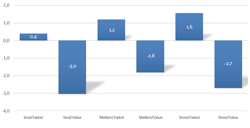 Medvinden for teknologiaktierne og de faldende og lave renter er de væsentligste forklaringer på, at valueaktierne på regionalt og globalt plan fortsætter med at klare sig dårligere end vækstaktierne. Afdelingerne med ligevægt og value har alle klaret sig dårligere end deres respektive benchmark.