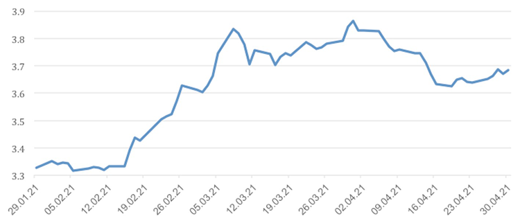 Den positive udvikling er drevet af stærke forventninger til den fremtidige vækst understøttet af udrulning af vaccine mod COVID-19, en lempelig pengepolitik, stimulipakker og faldende obligationsrenter. Vækstforventningerne trak også råvarepriserne op i april. Priserne på kobber steg næsten 12 % og olien med 6 %. Bløde råvarer som majs (+31 %), hvede (+20 %), sojabønner (+9 %) og bomuld (+8 %) nød ligeledes godt af de lysere forventninger til fremtiden.