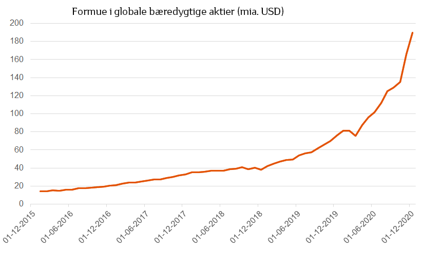 Opsparingerne er i stigende grad strømmet mod bæredygtige investeringer de senere år. Siden 2019 er tendensen accelereret voldsomt fra omkring 40 mia. dollars til ca. 190 mia. dollars ultimo 2020.