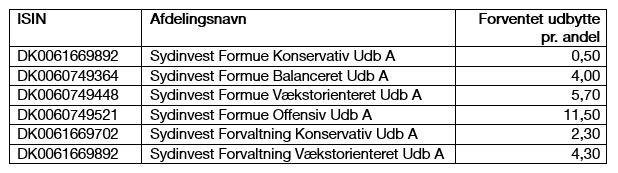 De forventede udbytter er angivet i kr. pr. andel: